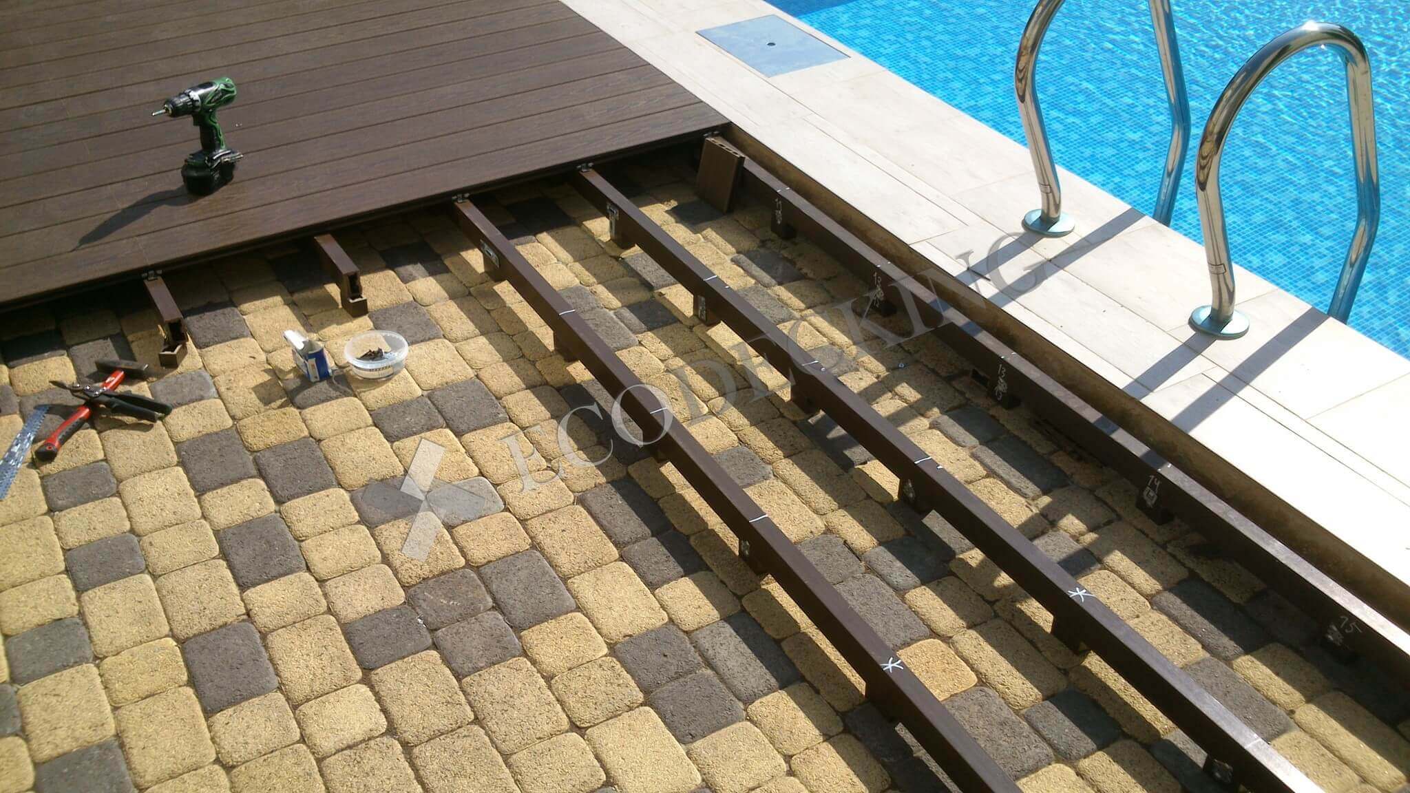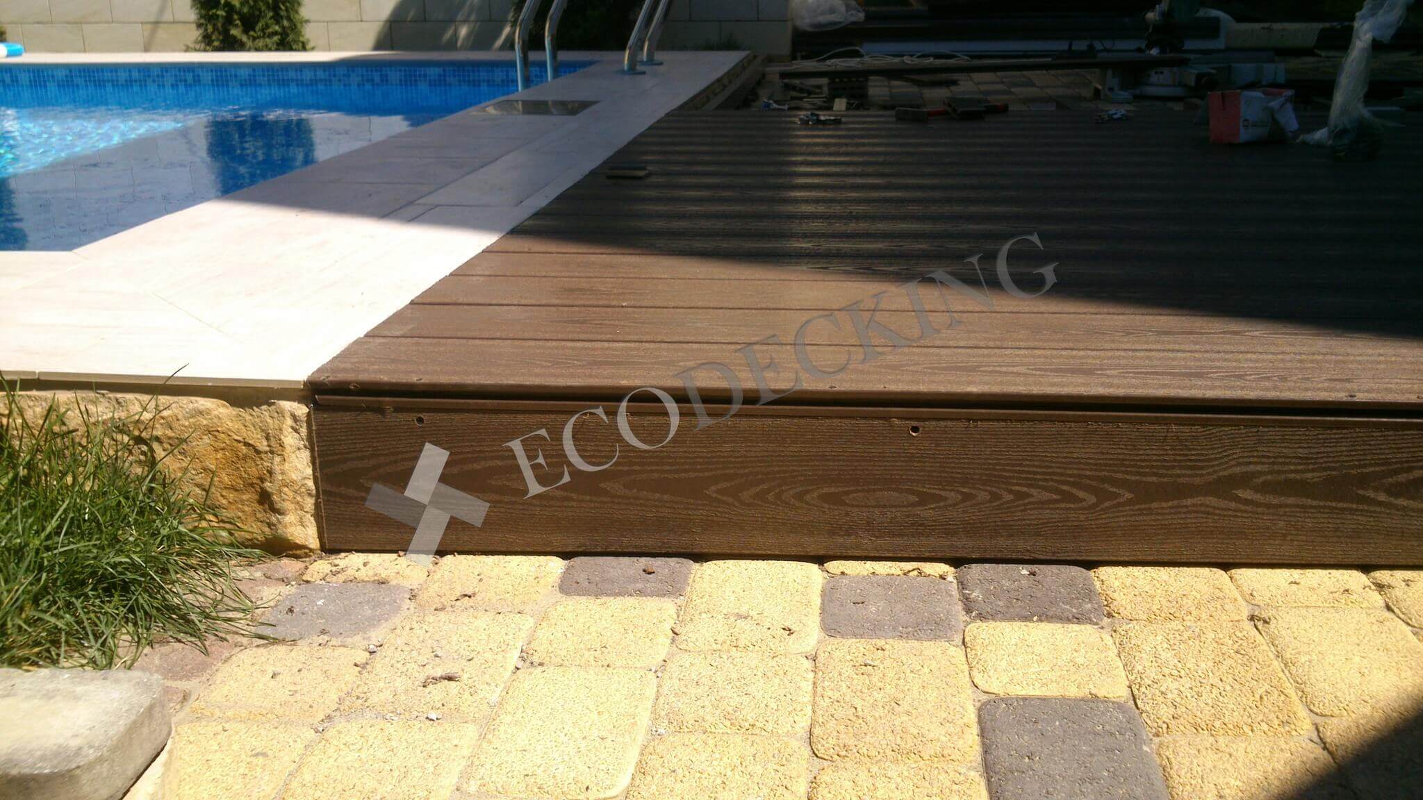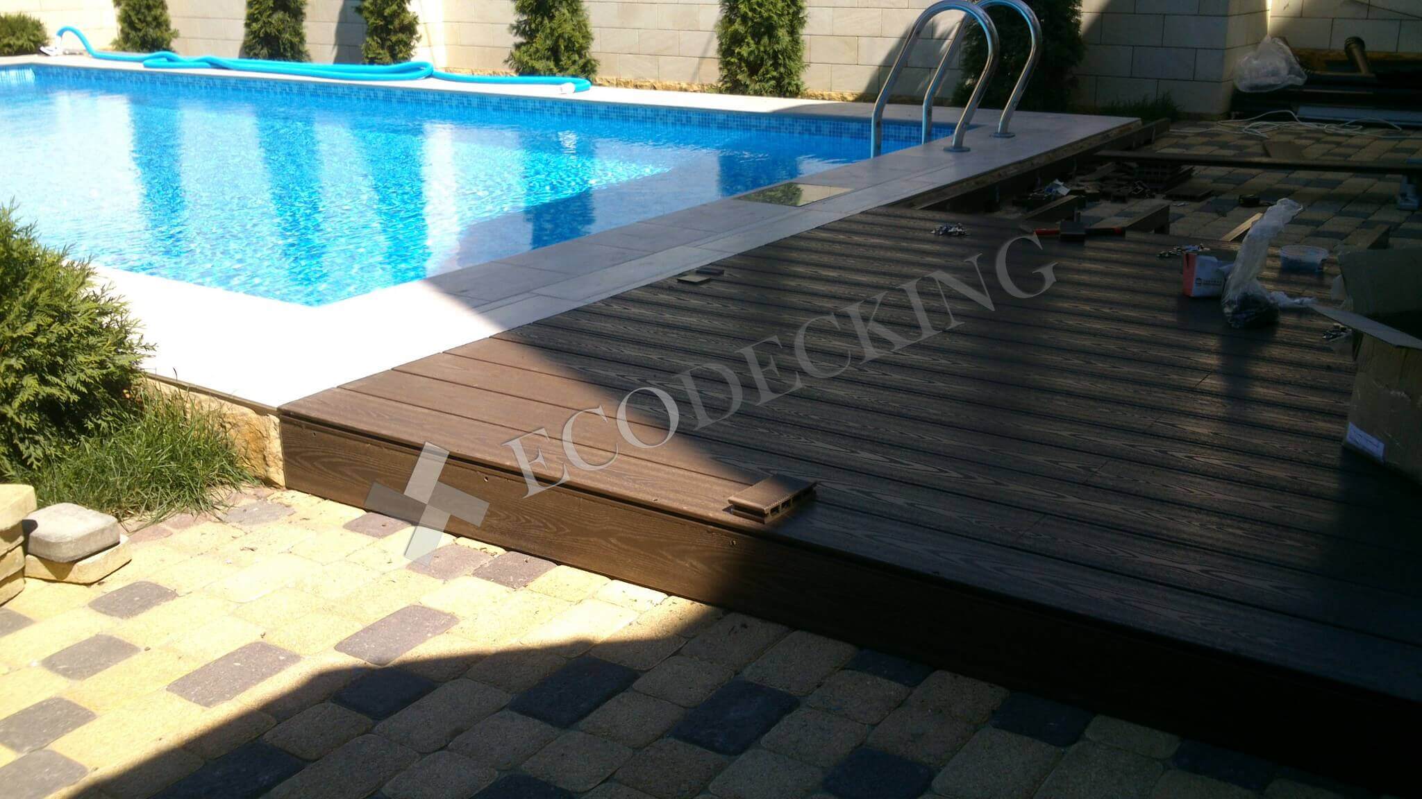 Если у вас во дворе есть даже небольшой бассейн, то рано или поздно вы задумаетесь о монтаже террасной доски вокруг него, как и наш заказчик с улицы Передерия в г.Краснодаре. Декинг ДПК не боится влажной среды и перепадов температур, не выцветает на солнце и не гниет, он сохраняет свой первозданный внешний вид, и производитель не боится давать 10 лет гарантии. Поверхность палубной доски из ДПК не скользкая и теплее, чем плитка. Монтаж террасной доски под силу даже человеку, который никогда не держал в руках строительный инструмент. Но если вы хотите получить идеальный результат, доверьте эту работу профессионалам компании ECODECKING.