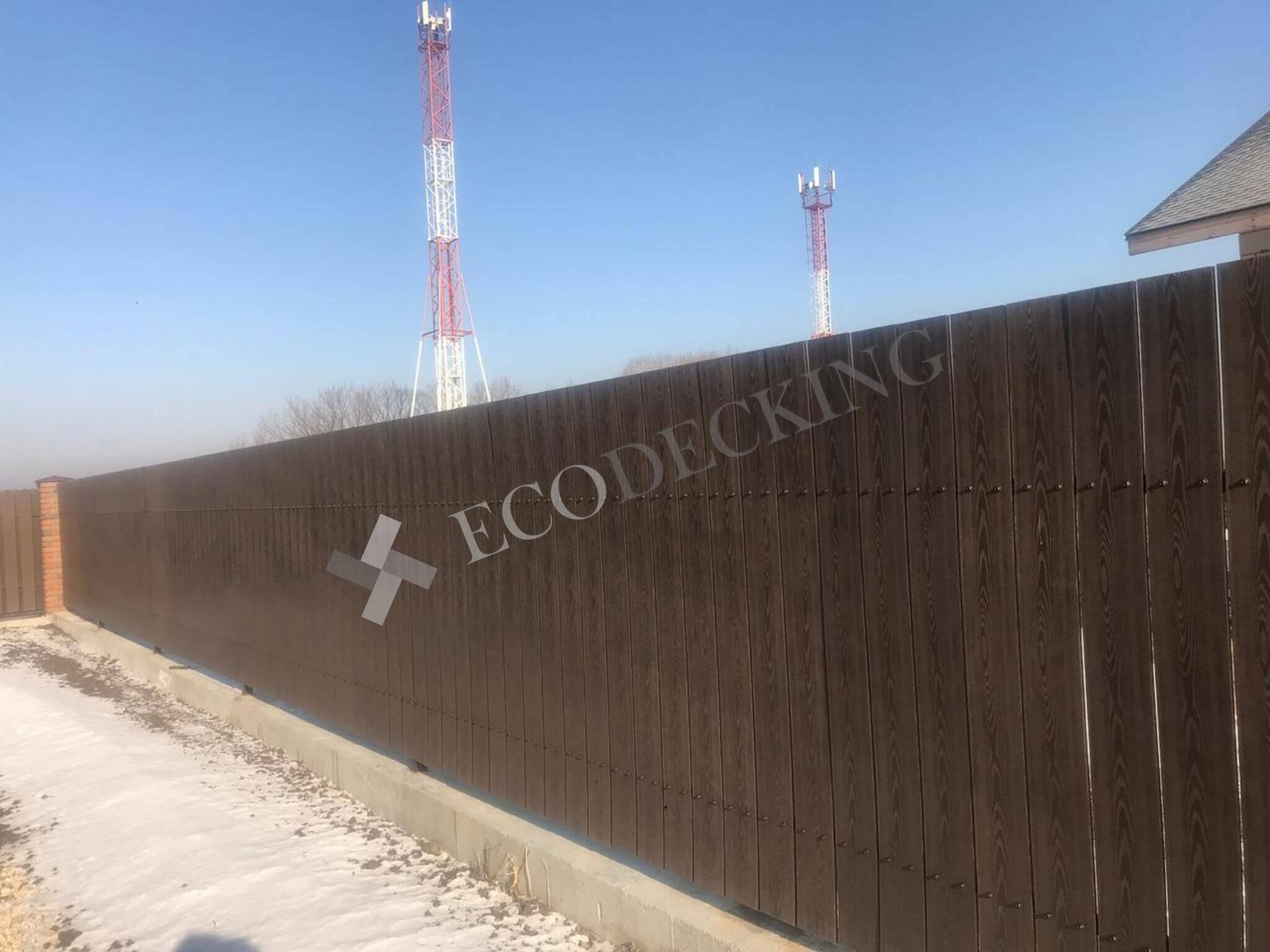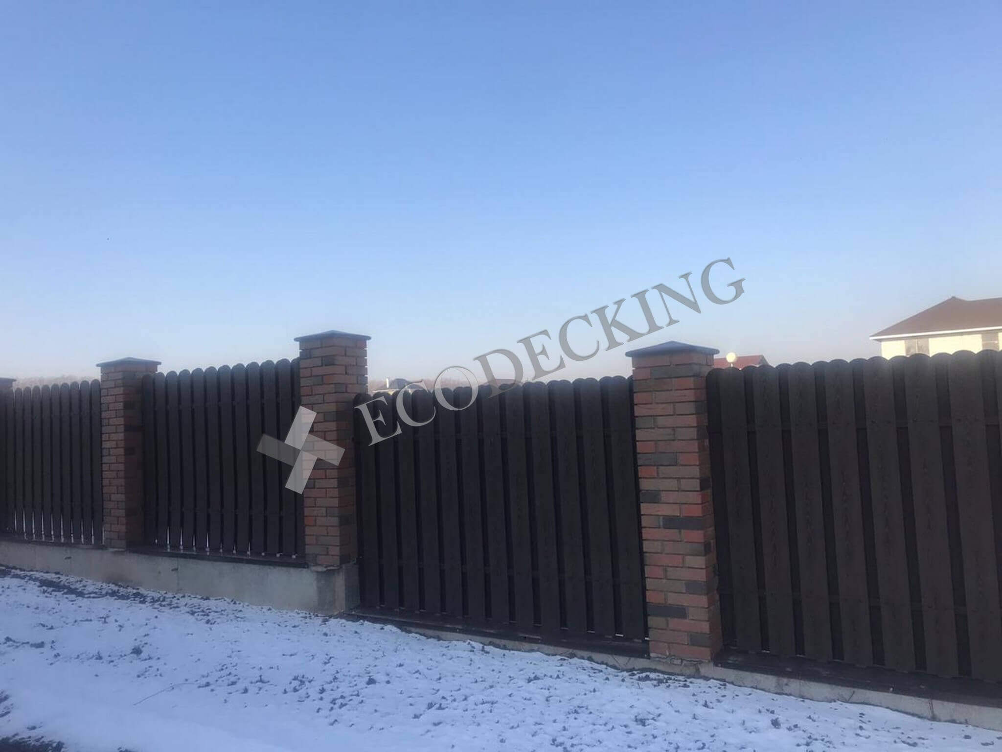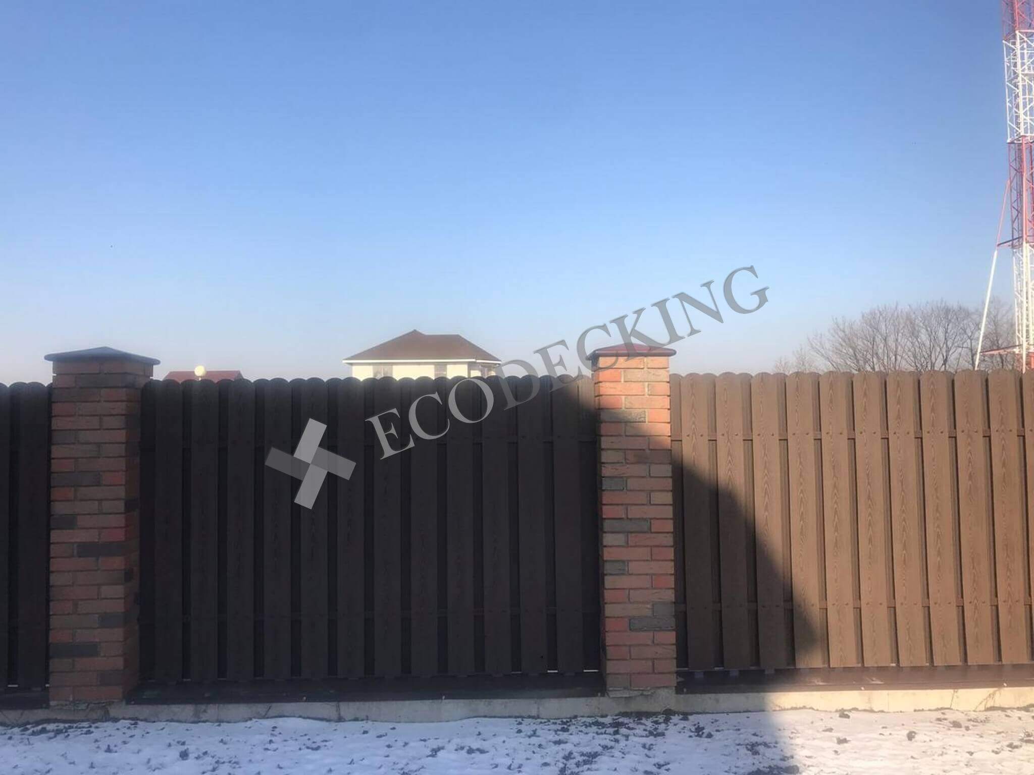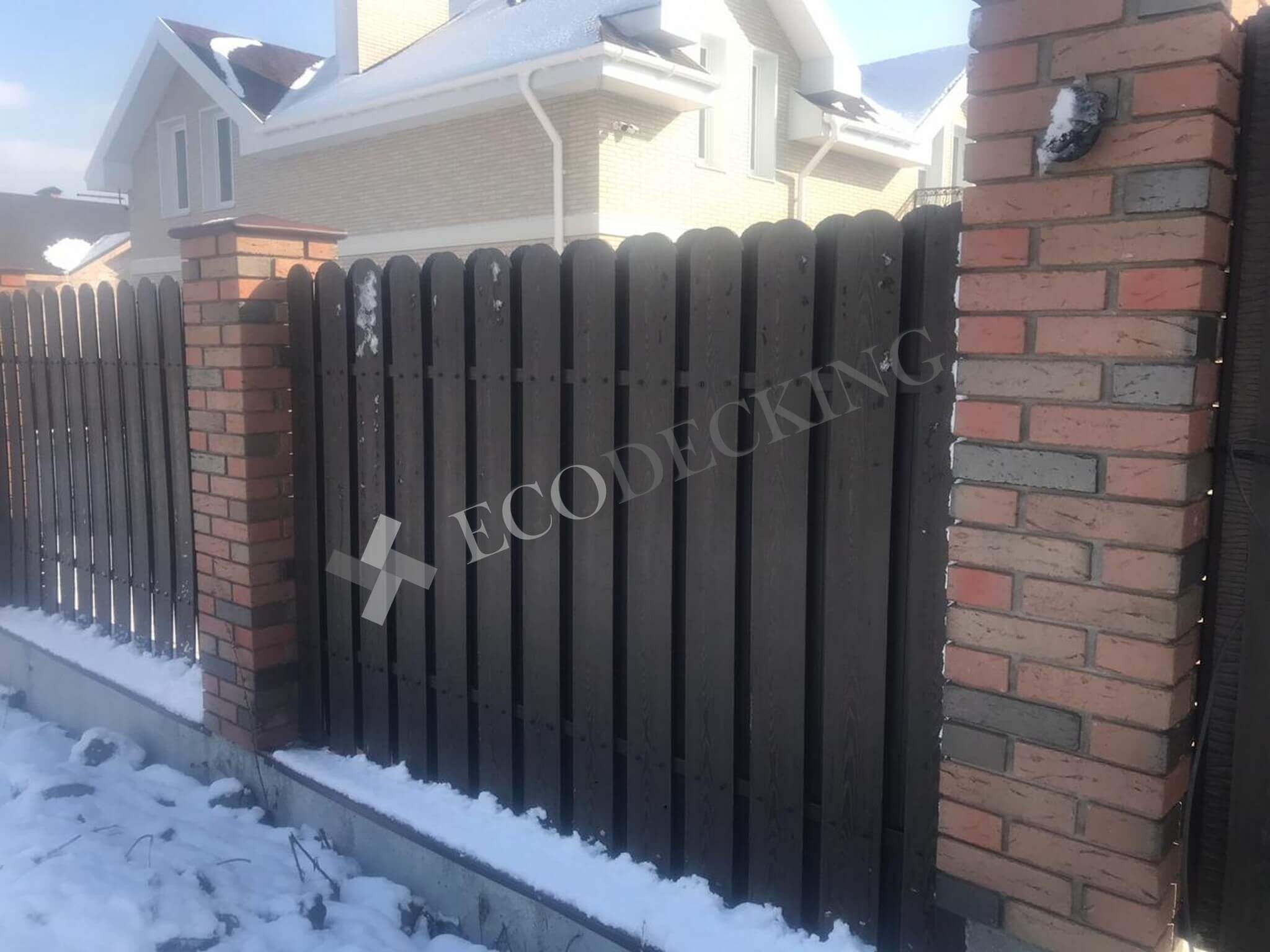 Заборная доска Ecodecking Classic цвет шоколад размер 11х145 выполняли монтаж у клиента в городе Южно Сахалинск на острове Сахалин в самом восточном крае нашей страны. Выполняли закругление доски по просьбе клиента. Было выполнено 2 варианта сборки забора: 1. Сплошной штакетник 2. Штакетник двухрядный. Результатом клиент удовлетворен.